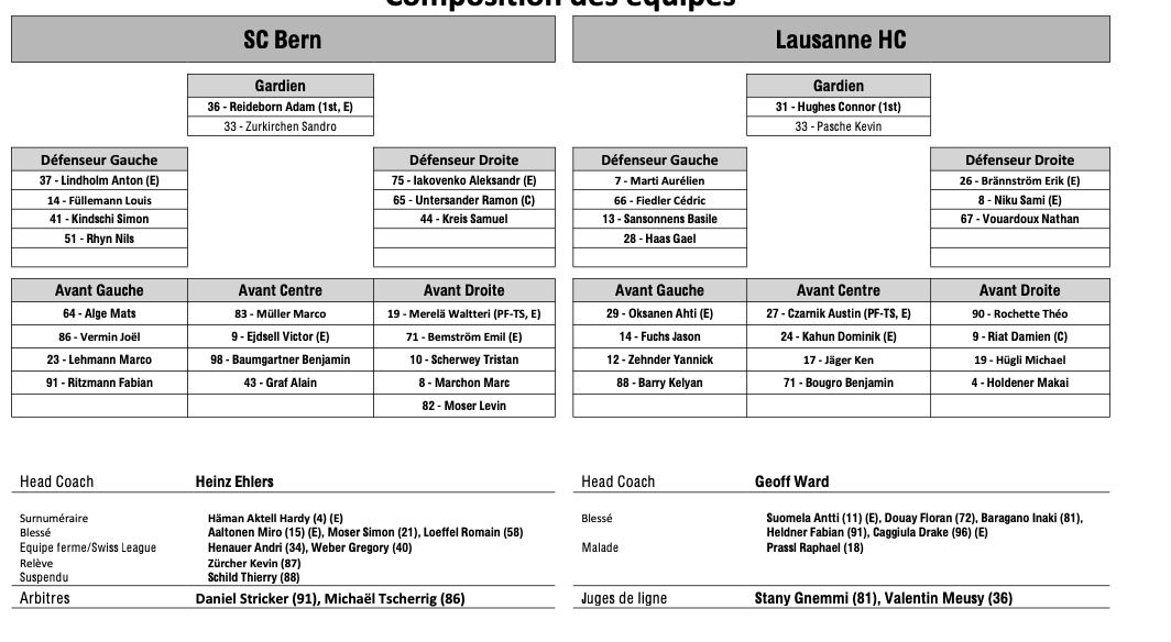 Formation des équipes et joueurs indisponibles pour le match Berne vs Lausanne 17/10/2025 Follow SwissHabs Derniers articles Il y a 4 minutes Ajoie se renforce avec Tarmo Reunanen pour cette fin de saison Il y a 15 minutes Trois joueurs absents du côté de Genève Il y a une heure Des nouvelles de l'infirmerie du HC Bienne Il y a 3 heures Nolan Diem portera les couleurs d'Ajoie Il y a 4 heures Le point sur l'effectif du CP Berne