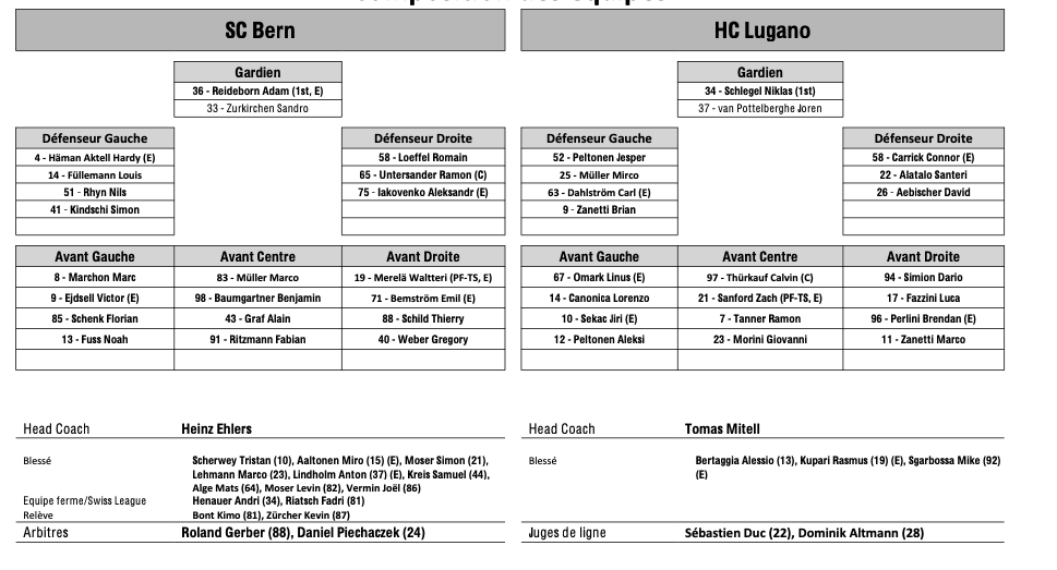 Formation des équipes et joueurs indisponibles pour le match Berne vs Lugano 24/10/2025 Follow SwissHabs Derniers articles Il y a 4 minutes Ajoie se renforce avec Tarmo Reunanen pour cette fin de saison Il y a 15 minutes Trois joueurs absents du côté de Genève Il y a une heure Des nouvelles de l'infirmerie du HC Bienne Il y a 3 heures Nolan Diem portera les couleurs d'Ajoie Il y a 4 heures Le point sur l'effectif du CP Berne
