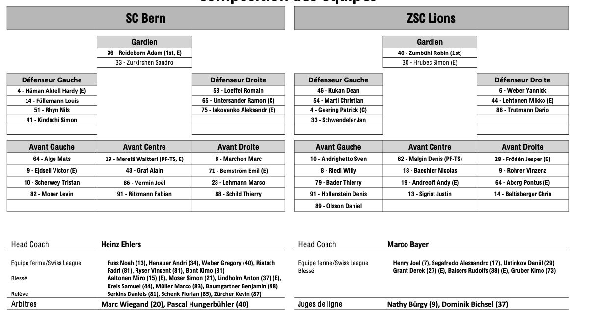 Formation des équipes et joueurs indisponibles pour le match Berne vs Zurich 01/11/2025 Follow SwissHabs Derniers articles Il y a 18 heures Régis Fuchs sera honoré cette semaine Il y a 19 heures Prolongations de contrats à l'EHC Coire Il y a 21 heures Diego Kostner absent quelques semaines Il y a 21 heures Pontus Åberg passera les prochains matchs à Kloten Il y a 23 heures Deux autres renforts pour le HC Viège