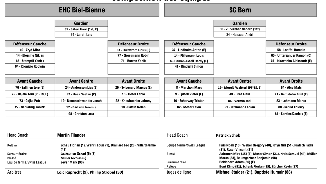Formation des équipes et joueurs indisponibles pour le match Bienne vs Berne 31/10/2025 Follow SwissHabs Derniers articles Il y a 50 minutes Le point sur l'effectif du CP Berne Il y a une heure JO : quel impact sur le développement du hockey aux Etats-Unis ? Il y a une heure Raphael Diaz va faire son retour au jeu face à Fribourg Il y a 2 heures Des nouvelles très mitigées concernant Marcus Sörensen Il y a 2 heures Un autre gardien à disposition du HC Ajoie