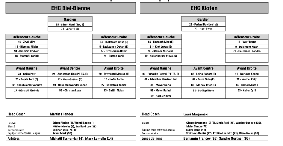 Formation des équipes et joueurs indisponibles pour le match Bienne vs Kloten 24/10/2025 Follow SwissHabs Derniers articles Il y a 4 minutes Ajoie se renforce avec Tarmo Reunanen pour cette fin de saison Il y a 15 minutes Trois joueurs absents du côté de Genève Il y a une heure Des nouvelles de l'infirmerie du HC Bienne Il y a 3 heures Nolan Diem portera les couleurs d'Ajoie Il y a 4 heures Le point sur l'effectif du CP Berne