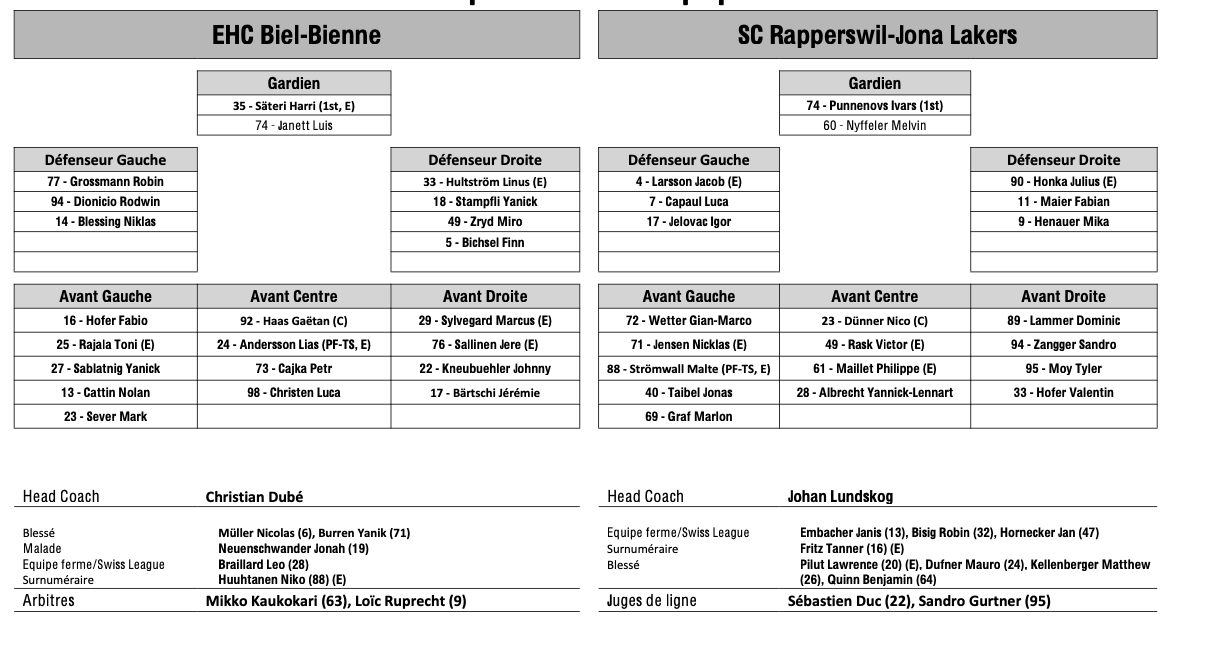 Formation des équipes et joueurs indisponibles pour le match Bienne vs Rapperswil 24/01/2026 Follow SwissHabs Derniers articles Il y a 15 heures Régis Fuchs sera honoré cette semaine Il y a 16 heures Prolongations de contrats à l'EHC Coire Il y a 18 heures Diego Kostner absent quelques semaines Il y a 18 heures Pontus Åberg passera les prochains matchs à Kloten Il y a 20 heures Deux autres renforts pour le HC Viège