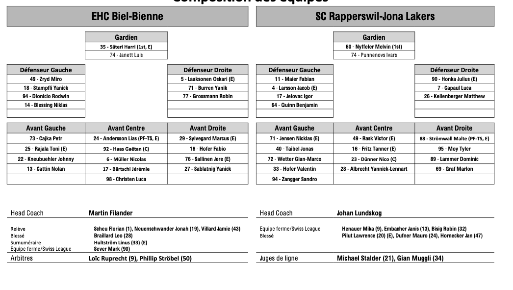 Formation des équipes et joueurs indisponibles pour le match Bienne vs Rapperswil 17/10/2025 Follow SwissHabs Derniers articles Il y a 4 minutes Ajoie se renforce avec Tarmo Reunanen pour cette fin de saison Il y a 15 minutes Trois joueurs absents du côté de Genève Il y a une heure Des nouvelles de l'infirmerie du HC Bienne Il y a 3 heures Nolan Diem portera les couleurs d'Ajoie Il y a 4 heures Le point sur l'effectif du CP Berne
