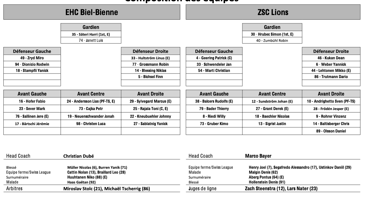 Formation des équipes et joueurs indisponibles pour le match Bienne vs Zurich 30/01/2026 Follow SwissHabs Derniers articles Il y a 15 heures Régis Fuchs sera honoré cette semaine Il y a 16 heures Prolongations de contrats à l'EHC Coire Il y a 18 heures Diego Kostner absent quelques semaines Il y a 18 heures Pontus Åberg passera les prochains matchs à Kloten Il y a 20 heures Deux autres renforts pour le HC Viège