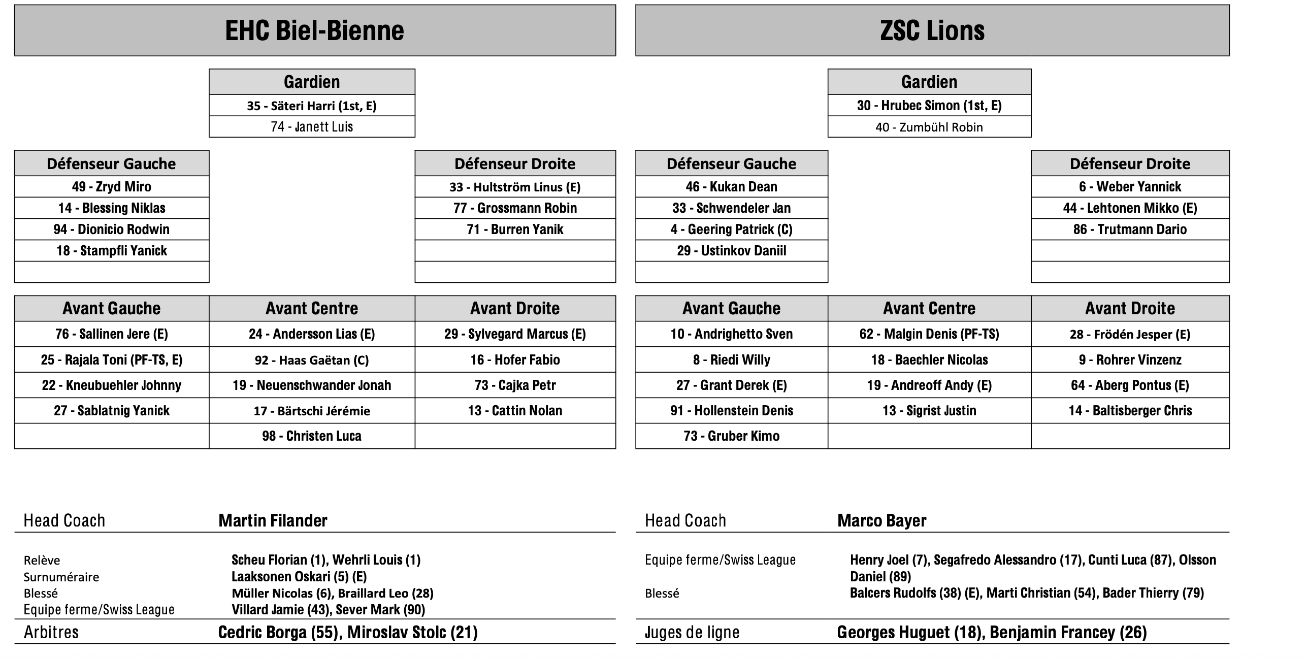 Formation des équipes et joueurs indisponibles pour le match Bienne vs Zurich 14/11/2025 Follow SwissHabs Derniers articles Il y a 18 heures Régis Fuchs sera honoré cette semaine Il y a 19 heures Prolongations de contrats à l'EHC Coire Il y a 21 heures Diego Kostner absent quelques semaines Il y a 21 heures Pontus Åberg passera les prochains matchs à Kloten Il y a 23 heures Deux autres renforts pour le HC Viège
