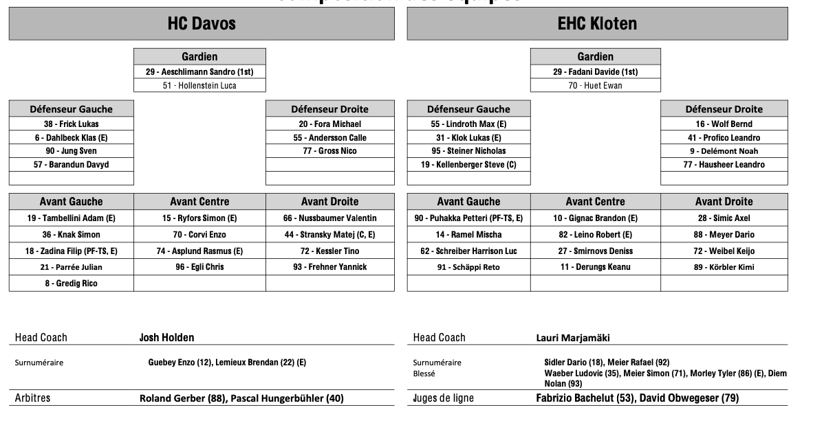 Formation des équipes et joueurs indisponibles pour le match Davos vs Kloten 16/09/2025 Follow SwissHabs Derniers articles Il y a 15 heures Régis Fuchs sera honoré cette semaine Il y a 16 heures Prolongations de contrats à l'EHC Coire Il y a 18 heures Diego Kostner absent quelques semaines Il y a 18 heures Pontus Åberg passera les prochains matchs à Kloten Il y a 20 heures Deux autres renforts pour le HC Viège