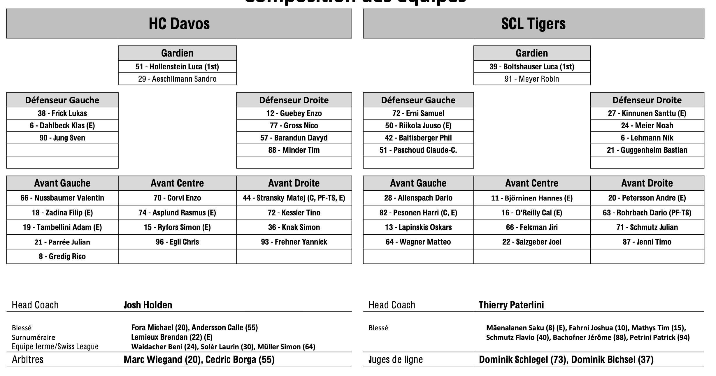 Formation des équipes et joueurs indisponibles pour le match Davos vs Langnau 25/10/2025 Follow SwissHabs Derniers articles Il y a 40 minutes Le point sur l'effectif du CP Berne Il y a une heure JO : quel impact sur le développement du hockey aux Etats-Unis ? Il y a une heure Raphael Diaz va faire son retour au jeu face à Fribourg Il y a 2 heures Des nouvelles très mitigées concernant Marcus Sörensen Il y a 2 heures Un autre gardien à disposition du HC Ajoie