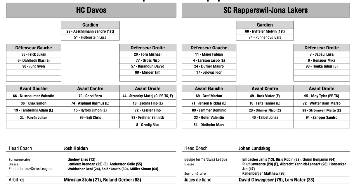 Formation des équipes et joueurs indisponibles pour le match Davos vs Rapperswil 01/11/2025 Follow SwissHabs Derniers articles Il y a 18 heures Régis Fuchs sera honoré cette semaine Il y a 19 heures Prolongations de contrats à l'EHC Coire Il y a 21 heures Diego Kostner absent quelques semaines Il y a 21 heures Pontus Åberg passera les prochains matchs à Kloten Il y a 23 heures Deux autres renforts pour le HC Viège