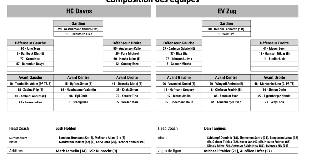Formation des équipes et joueurs indisponibles pour le match Davos vs Zoug 16/03/2025 Follow SwissHabs Derniers articles Il y a 29 minutes Enzo Corvi se rapproche d'un retour au jeu Il y a une heure Nico Dünner blessé : Jacob Larsson nouveau capitaine des Rapperswil-Jona Lakers Il y a une heure Le EHC Bâle prolonge Barbei et Supinski Il y a une heure Ajoie se renforce avec Tarmo Reunanen pour cette fin de saison Il y a une heure Trois joueurs absents du côté de Genève