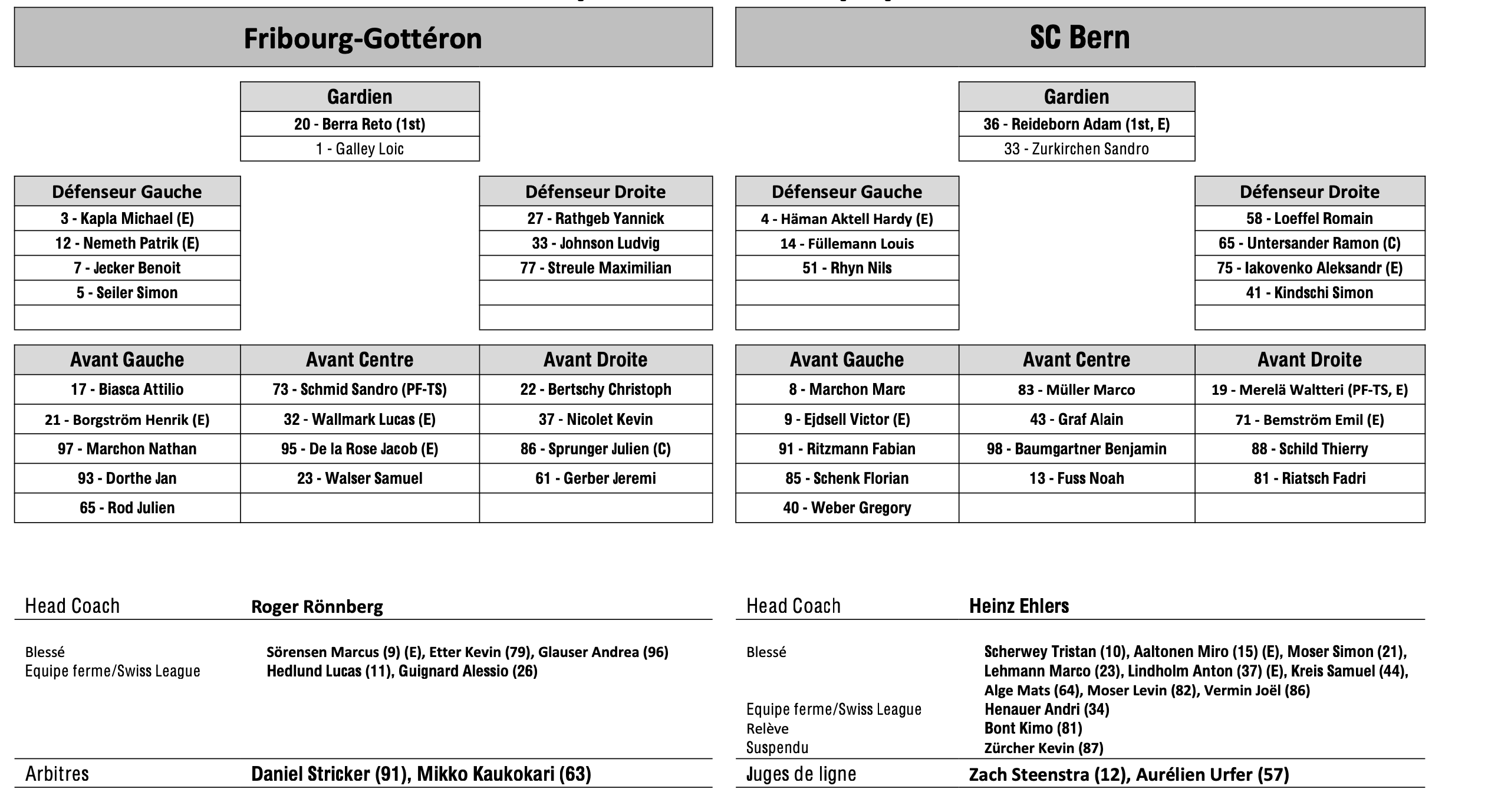 Formation des équipes et joueurs indisponibles pour le match Fribourg vs Berne 25/10/2025 Follow SwissHabs Derniers articles Il y a 50 minutes Le point sur l'effectif du CP Berne Il y a une heure JO : quel impact sur le développement du hockey aux Etats-Unis ? Il y a une heure Raphael Diaz va faire son retour au jeu face à Fribourg Il y a 2 heures Des nouvelles très mitigées concernant Marcus Sörensen Il y a 2 heures Un autre gardien à disposition du HC Ajoie