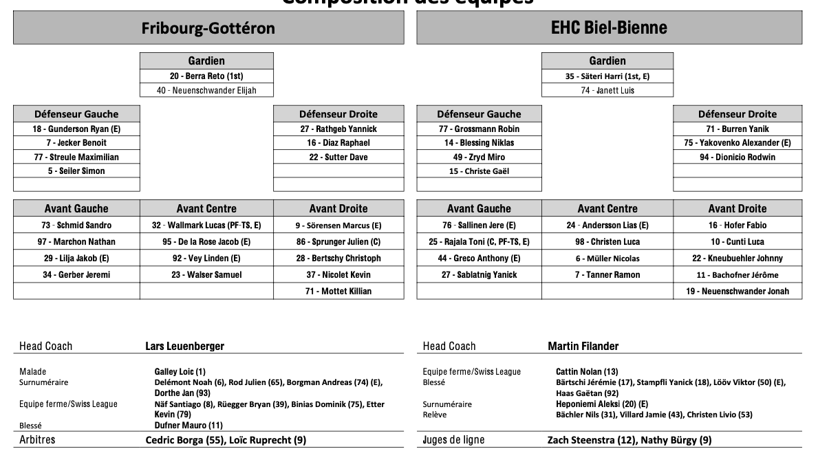 Formation des équipes et joueurs indisponibles pour le match Fribourg vs Bienne 25/02/2025 Follow SwissHabs Derniers articles Il y a 34 minutes Les autres faits à retenir de cette nuit de NHL et de la prochaine Il y a une heure Martin Gerber figure toujours en bonne place sur cette liste Il y a 2 heures Berne aurait porté son choix sur Ville Peltonen Il y a 3 heures 700 assists en NHL pour Nikita Kucherov Il y a 3 heures Tyler Myers sans doute sur le départ