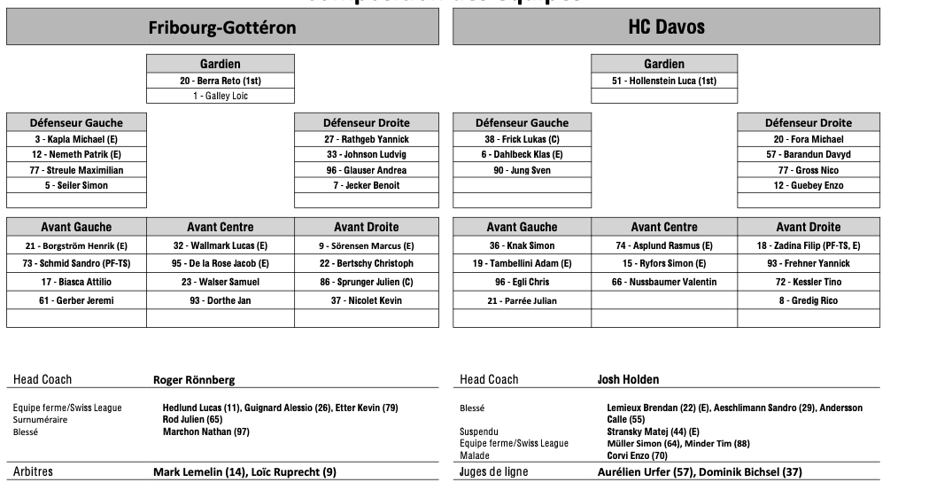 Formation des équipes et joueurs indisponibles pour le match Fribourg vs Davos 14/11/2025 Follow SwissHabs Derniers articles Il y a 8 minutes Raphael Diaz va faire son retour au jeu face à Fribourg Il y a 34 minutes Des nouvelles très mitigées concernant Marcus Sörensen Il y a 47 minutes Un autre gardien à disposition du HC Ajoie Il y a une heure Un petit rafraîchissement pour le site SwissHabs Il y a 20 heures Régis Fuchs sera honoré cette semaine