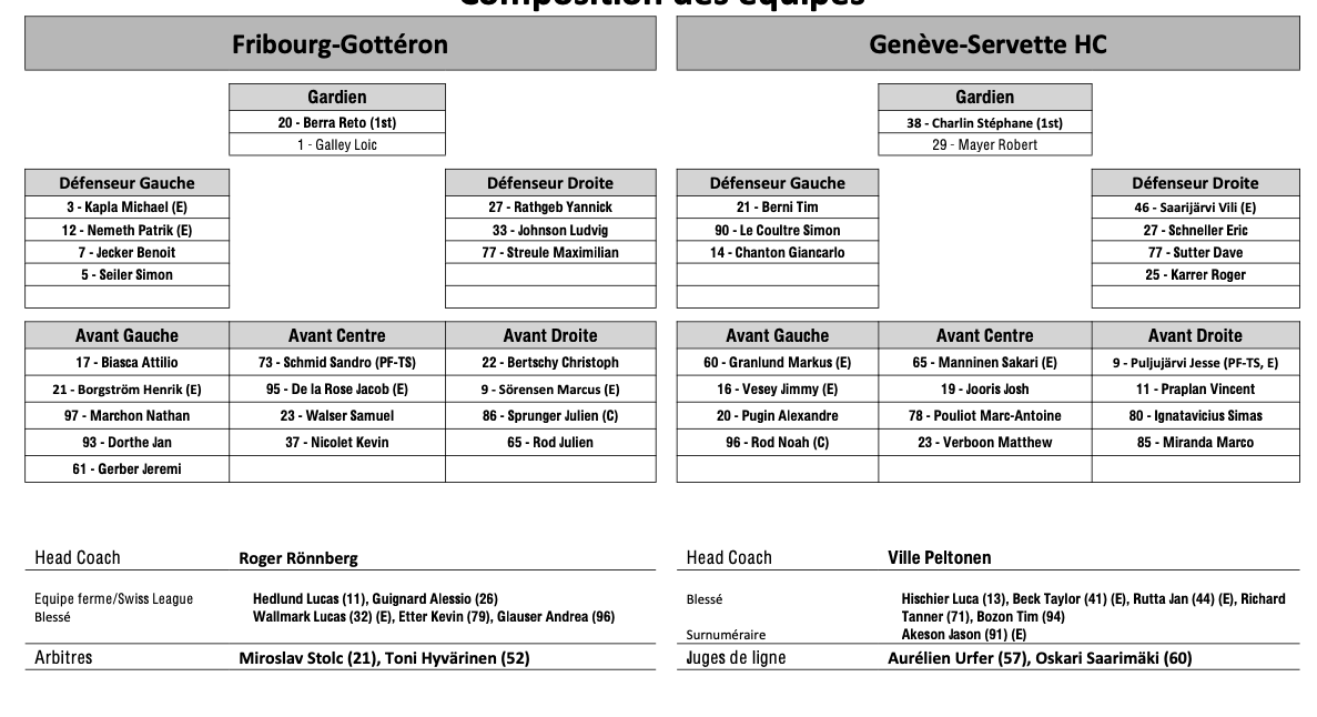 Formation des équipes et joueurs indisponibles pour le match Fribourg vs Genève 17/10/2025 Follow SwissHabs Derniers articles Il y a 2 minutes Le EHC Bâle prolonge Barbei et Supinski Il y a 15 minutes Ajoie se renforce avec Tarmo Reunanen pour cette fin de saison Il y a 26 minutes Trois joueurs absents du côté de Genève Il y a une heure Des nouvelles de l'infirmerie du HC Bienne Il y a 3 heures Nolan Diem portera les couleurs d'Ajoie