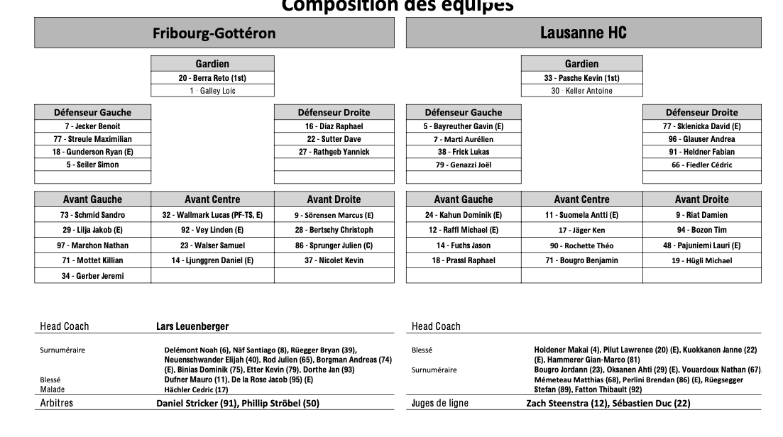 Formation des équipes et joueurs indisponibles pour le match Fribourg vs Lausanne 01/04/2025 Follow SwissHabs Derniers articles Il y a 29 minutes Enzo Corvi se rapproche d'un retour au jeu Il y a une heure Nico Dünner blessé : Jacob Larsson nouveau capitaine des Rapperswil-Jona Lakers Il y a une heure Le EHC Bâle prolonge Barbei et Supinski Il y a une heure Ajoie se renforce avec Tarmo Reunanen pour cette fin de saison Il y a une heure Trois joueurs absents du côté de Genève