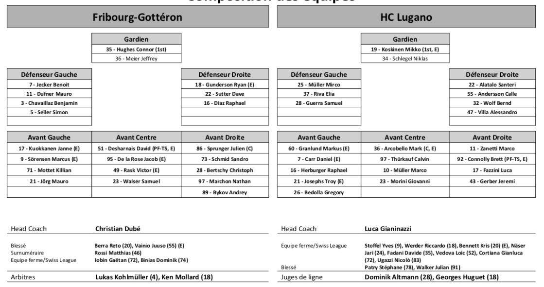Formation des équipes et joueurs indisponibles pour le match Fribourg vs Lugano 20/12/2022 Follow SwissHabs Derniers articles Il y a 50 minutes Le point sur l'effectif du CP Berne Il y a une heure JO : quel impact sur le développement du hockey aux Etats-Unis ? Il y a une heure Raphael Diaz va faire son retour au jeu face à Fribourg Il y a 2 heures Des nouvelles très mitigées concernant Marcus Sörensen Il y a 2 heures Un autre gardien à disposition du HC Ajoie
