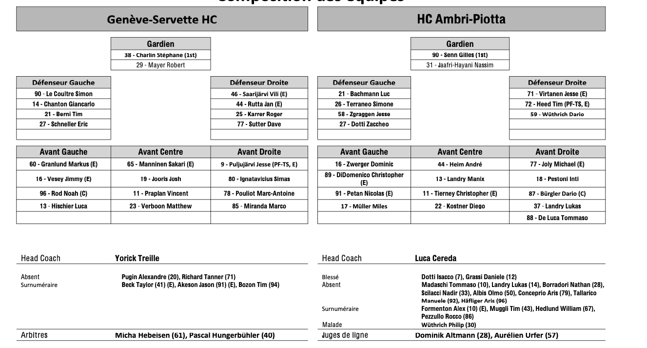 Formation des équipes et joueurs indisponibles pour le match Genève vs Ambri 23/09/2025 Follow SwissHabs Derniers articles Il y a 17 heures Régis Fuchs sera honoré cette semaine Il y a 18 heures Prolongations de contrats à l'EHC Coire Il y a 20 heures Diego Kostner absent quelques semaines Il y a 20 heures Pontus Åberg passera les prochains matchs à Kloten Il y a 22 heures Deux autres renforts pour le HC Viège