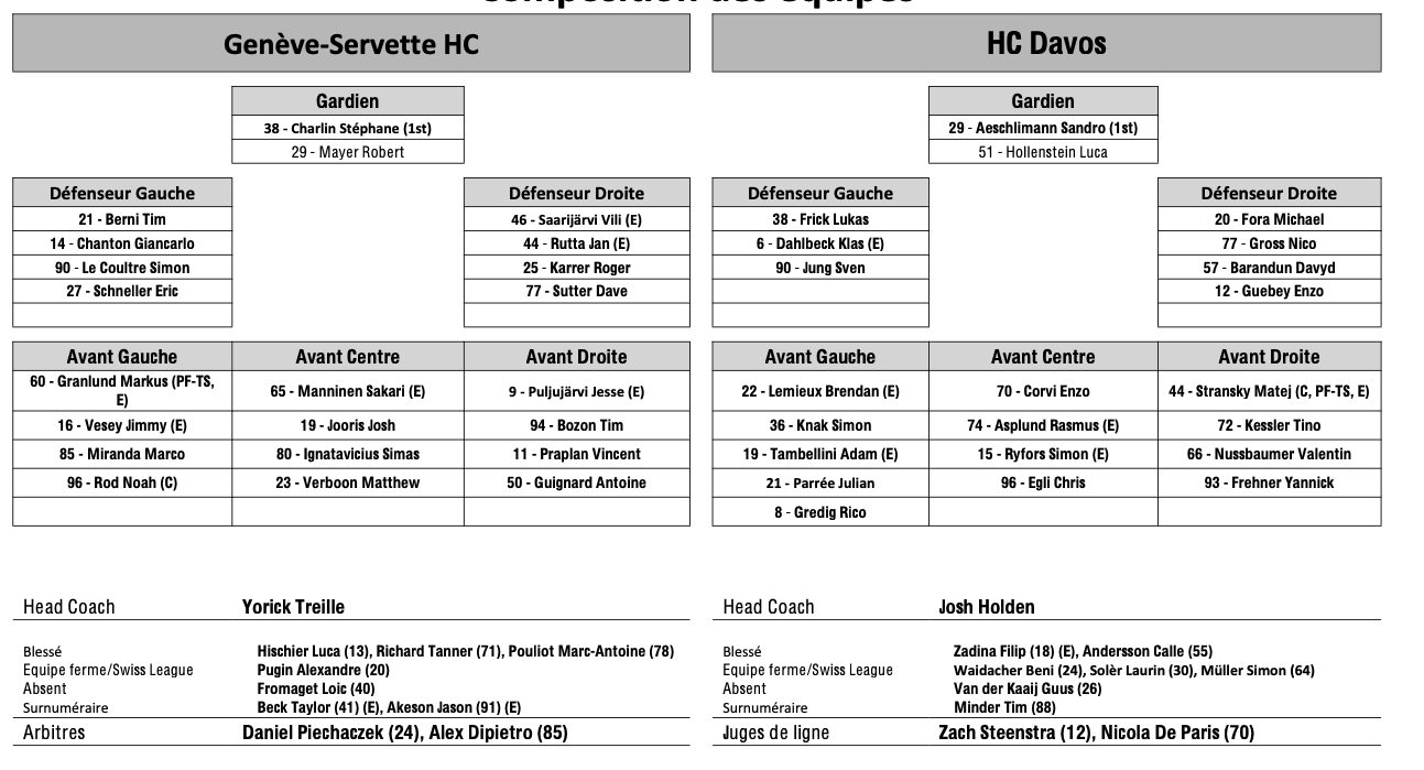 Formation des équipes et joueurs indisponibles pour le match Genève vs Davos 28/10/2025 Follow SwissHabs Derniers articles Il y a 17 heures Régis Fuchs sera honoré cette semaine Il y a 18 heures Prolongations de contrats à l'EHC Coire Il y a 20 heures Diego Kostner absent quelques semaines Il y a 20 heures Pontus Åberg passera les prochains matchs à Kloten Il y a 22 heures Deux autres renforts pour le HC Viège