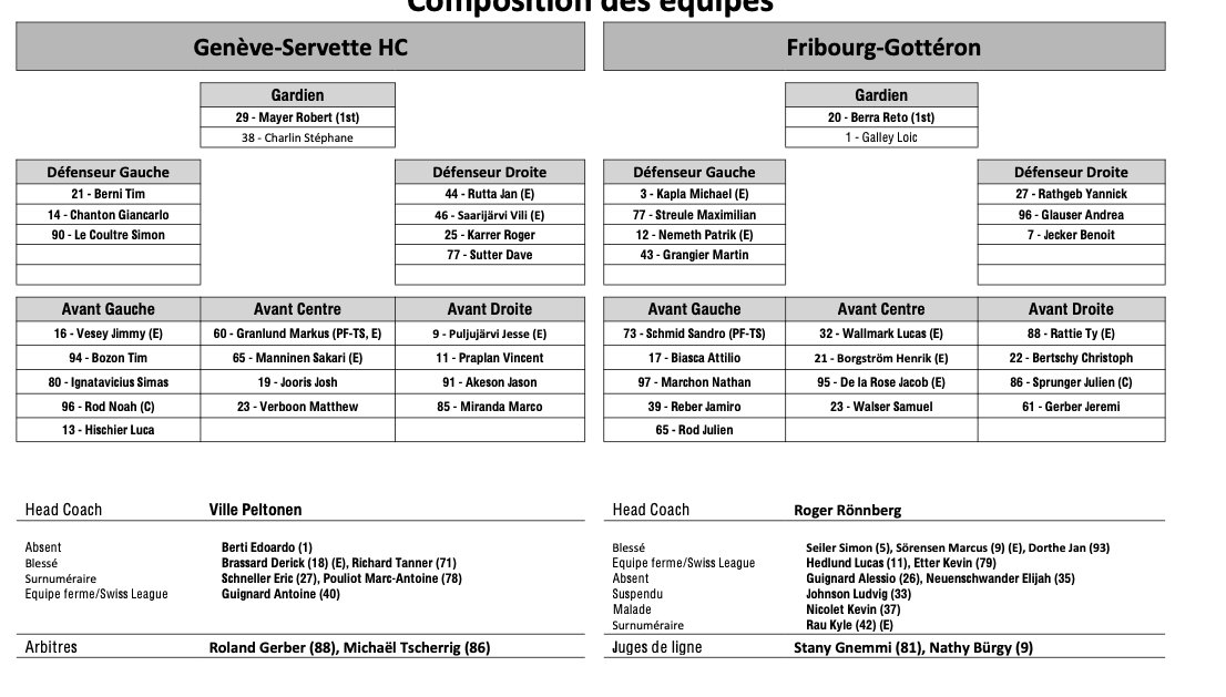 Formation des équipes et joueurs indisponibles pour le match Genève vs Fribourg 29/01/2026 Follow SwissHabs Derniers articles Il y a 14 heures Régis Fuchs sera honoré cette semaine Il y a 15 heures Prolongations de contrats à l'EHC Coire Il y a 17 heures Diego Kostner absent quelques semaines Il y a 17 heures Pontus Åberg passera les prochains matchs à Kloten Il y a 19 heures Deux autres renforts pour le HC Viège