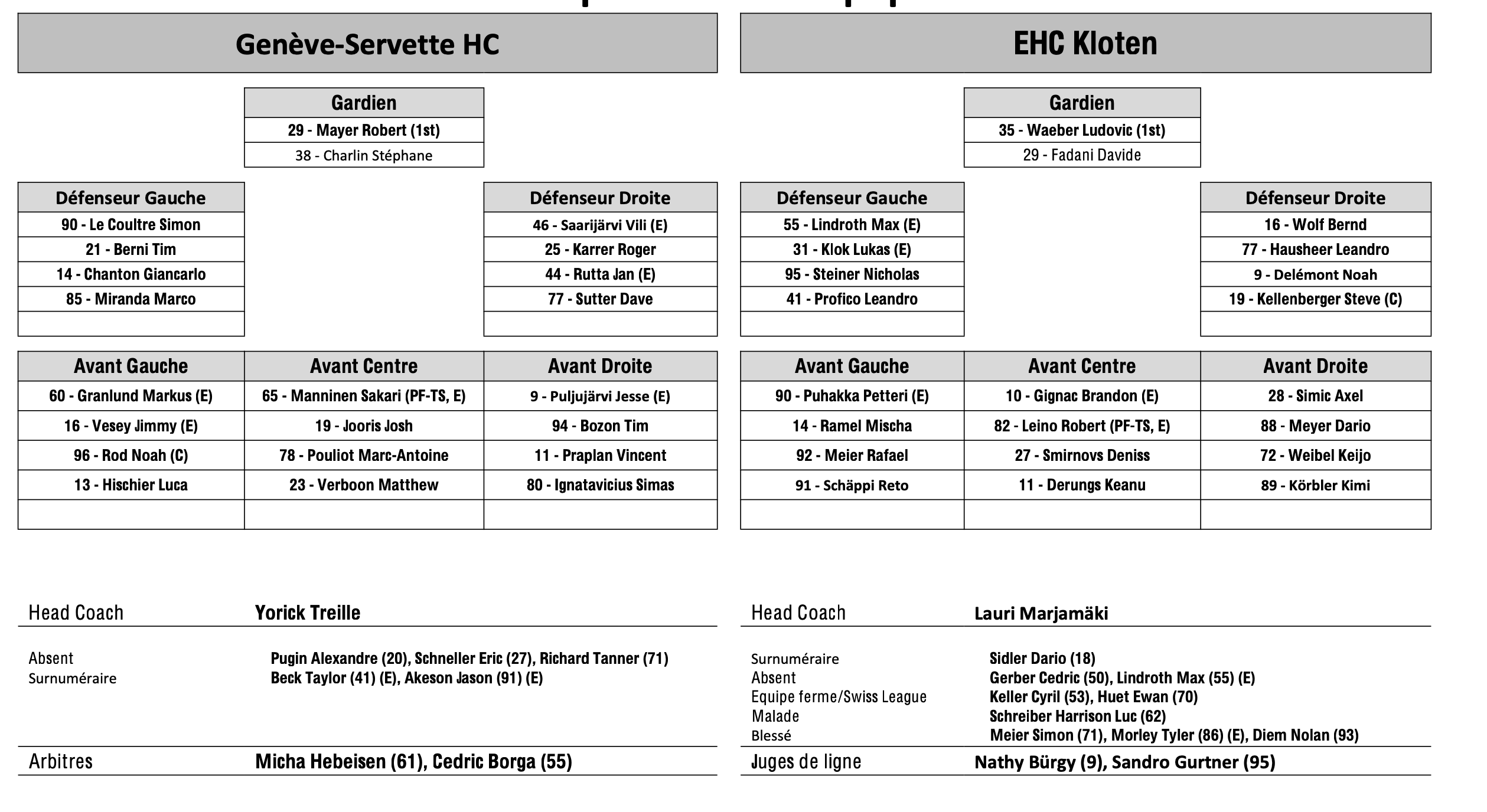 Formation des équipes et joueurs indisponibles pour le match Genève vs Kloten 13/09/2025 Follow SwissHabs Derniers articles Il y a 17 heures Régis Fuchs sera honoré cette semaine Il y a 18 heures Prolongations de contrats à l'EHC Coire Il y a 20 heures Diego Kostner absent quelques semaines Il y a 20 heures Pontus Åberg passera les prochains matchs à Kloten Il y a 22 heures Deux autres renforts pour le HC Viège