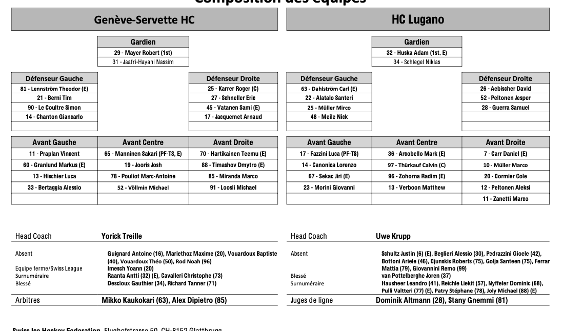 Formation des équipes et joueurs indisponibles pour le match Genève vs Lugano 27/02/2025 Follow SwissHabs Derniers articles Il y a 7 heures Retour de l'action en NHL : quelques chiffres à retenir Il y a 9 heures Lian Bichsel de retour, Nino Niederreiter blessé Il y a 10 heures Pénurie d’entraîneurs suisses d’élite en hockey sur glace Il y a 11 heures Un mois d'absence pour Sidney Crosby Il y a 13 heures Changements au sein du département athlétique des SCL Tigers et SCL Young Tigers