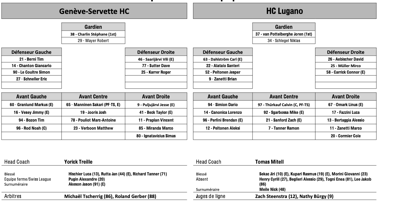 Formation des équipes et joueurs indisponibles pour le match Genève vs Lugano 03/10/2025 Follow SwissHabs Derniers articles Il y a 15 heures Régis Fuchs sera honoré cette semaine Il y a 16 heures Prolongations de contrats à l'EHC Coire Il y a 18 heures Diego Kostner absent quelques semaines Il y a 18 heures Pontus Åberg passera les prochains matchs à Kloten Il y a 20 heures Deux autres renforts pour le HC Viège