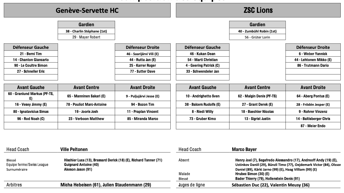 Formation des équipes et joueurs indisponibles pour le match Genève vs Zurich 02/01/2026 Follow SwissHabs Derniers articles Il y a 17 heures Régis Fuchs sera honoré cette semaine Il y a 18 heures Prolongations de contrats à l'EHC Coire Il y a 20 heures Diego Kostner absent quelques semaines Il y a 20 heures Pontus Åberg passera les prochains matchs à Kloten Il y a 22 heures Deux autres renforts pour le HC Viège