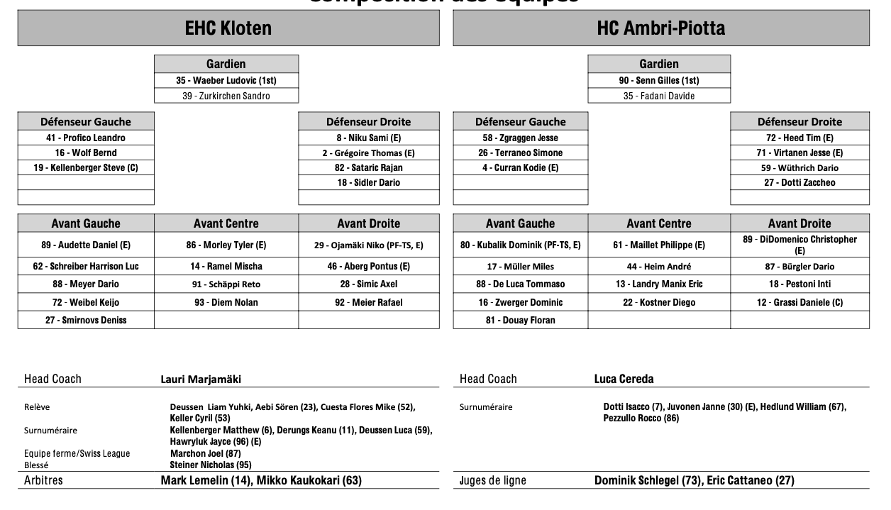 Formation des équipes et joueurs indisponibles pour le match Kloten vs Ambri 10/03/2025 Follow SwissHabs Derniers articles Il y a 7 heures Les Scorer King de Swiss League vont être tous mignons Il y a 7 heures La cuvée de 2026 du Temple de la renommée de la LHJMQ Il y a 9 heures Echange entre les Penguins de Pittsburgh et l'Avalanche du Colorado Il y a 10 heures Formation des équipes et joueurs indisponibles pour le match Davos vs Langnau Il y a 10 heures Formation des équipes et joueurs indisponibles pour le match Rapperswil vs Genève