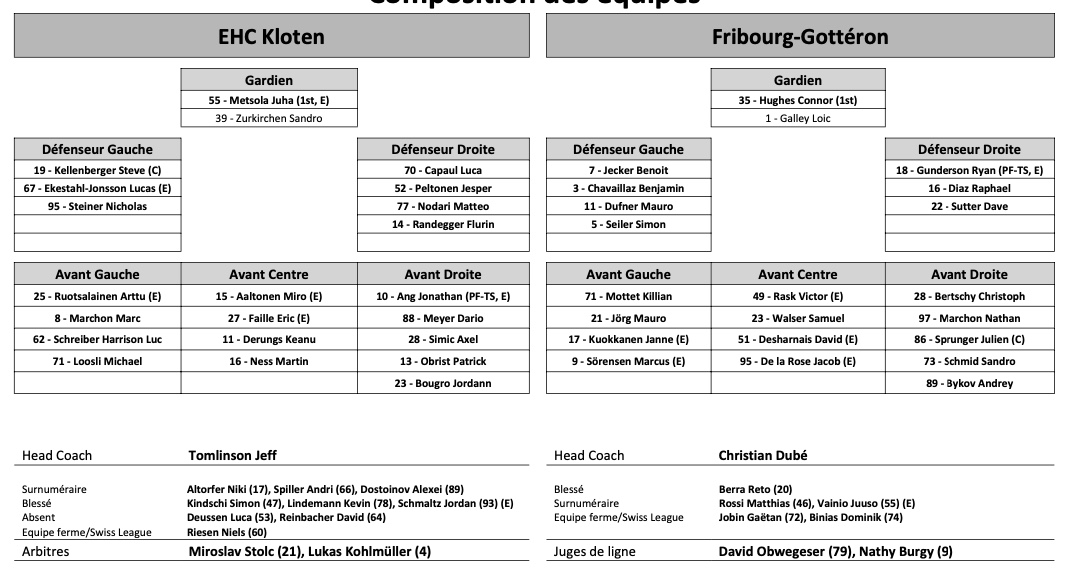 Formation des équipes et joueurs indisponibles pour le match Kloten vs Fribourg 02/01/2023 Follow SwissHabs Derniers articles Il y a 6 minutes Reto Berra et Damiano Ciaccio ne terminent pas le match Il y a 27 minutes La folle et coûteuse nuit dorée de Team USA Il y a 45 minutes Seattle prolonge deux attaquants de soutien Il y a 53 minutes Retour complet sur la soirée de National League Il y a 9 heures Les Scorer King de Swiss League vont être tous mignons