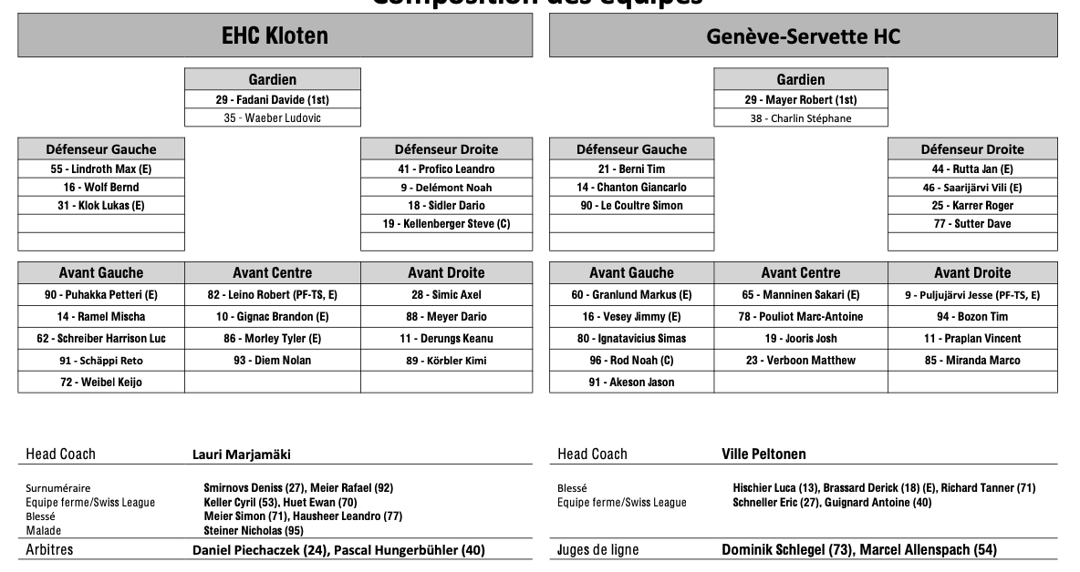 Formation des équipes et joueurs indisponibles pour le match Kloten vs Genève 10/01/2026 Follow SwissHabs Derniers articles Il y a 15 heures Régis Fuchs sera honoré cette semaine Il y a 16 heures Prolongations de contrats à l'EHC Coire Il y a 18 heures Diego Kostner absent quelques semaines Il y a 18 heures Pontus Åberg passera les prochains matchs à Kloten Il y a 20 heures Deux autres renforts pour le HC Viège
