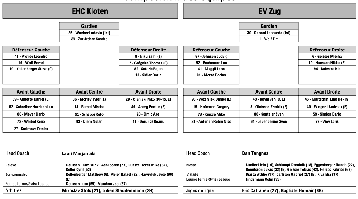 Formation des équipes et joueurs indisponibles pour le match Kloten vs Zoug 27/02/2025 Follow SwissHabs Derniers articles Il y a 7 heures Retour de l'action en NHL : quelques chiffres à retenir Il y a 9 heures Lian Bichsel de retour, Nino Niederreiter blessé Il y a 10 heures Pénurie d’entraîneurs suisses d’élite en hockey sur glace Il y a 11 heures Un mois d'absence pour Sidney Crosby Il y a 13 heures Changements au sein du département athlétique des SCL Tigers et SCL Young Tigers