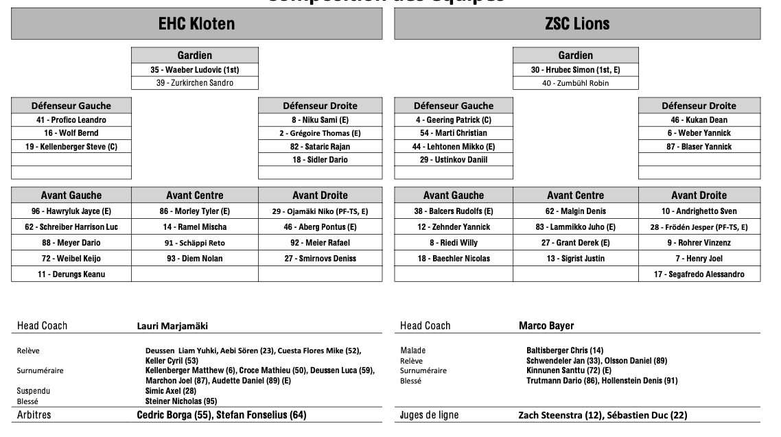 Formation des équipes et joueurs indisponibles pour le match Kloten vs Zurich 15/03/2025 Follow SwissHabs Derniers articles Il y a 13 minutes Les Blues acquièrent Gauthier dans un échange avec les Islanders Il y a 55 minutes Mikko Rantanen blessé et absent avec les Stars après les JO Il y a une heure Tarmo Reunanen a été exclu de son équipe Il y a 2 heures Enzo Corvi se rapproche d'un retour au jeu Il y a 2 heures Nico Dünner blessé : Jacob Larsson nouveau capitaine des Rapperswil-Jona Lakers