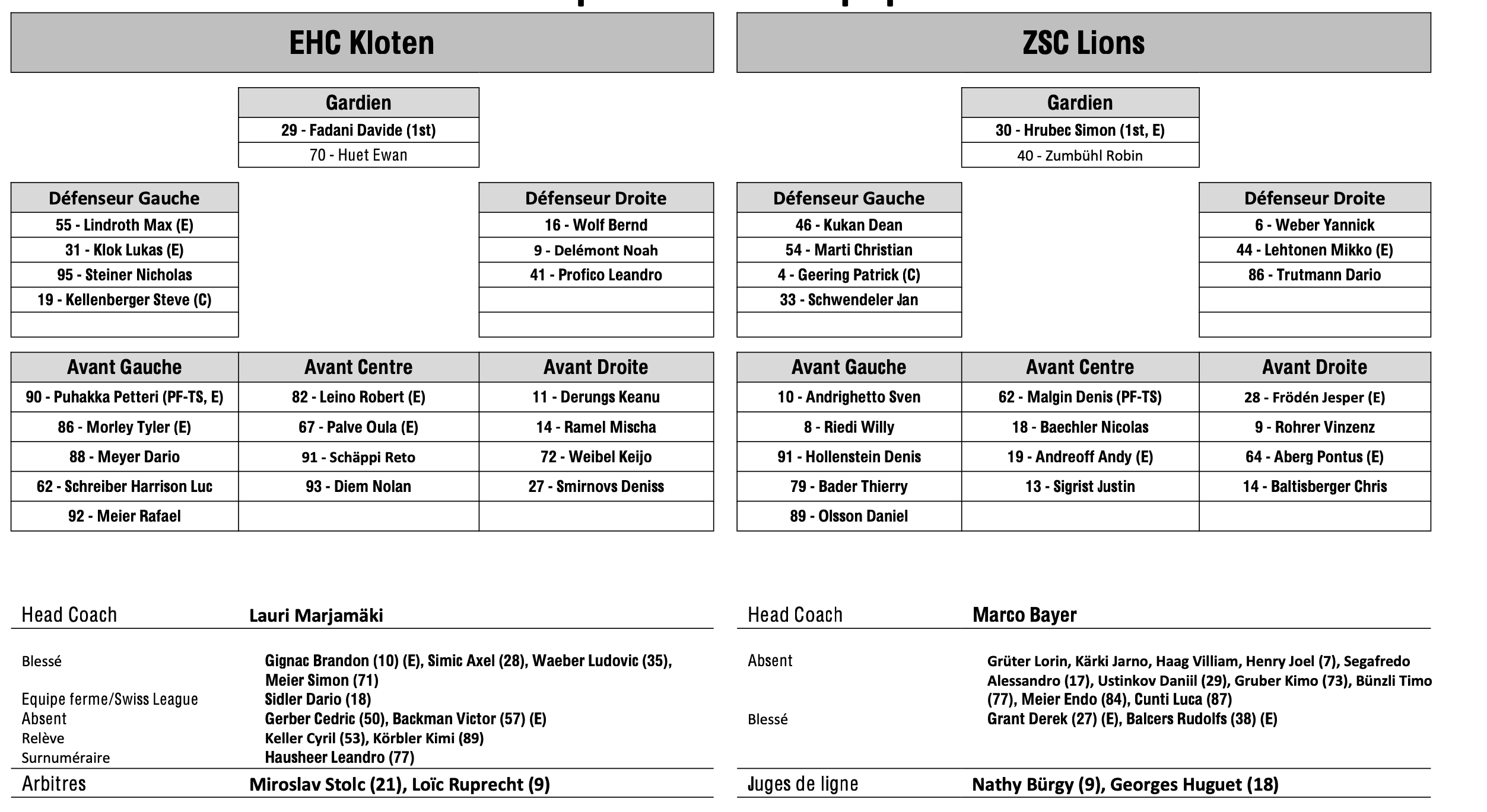 Formation des équipes et joueurs indisponibles pour le match Kloten vs Zurich 25/10/2025 Follow SwissHabs Derniers articles Il y a 50 minutes Le point sur l'effectif du CP Berne Il y a une heure JO : quel impact sur le développement du hockey aux Etats-Unis ? Il y a une heure Raphael Diaz va faire son retour au jeu face à Fribourg Il y a 2 heures Des nouvelles très mitigées concernant Marcus Sörensen Il y a 2 heures Un autre gardien à disposition du HC Ajoie