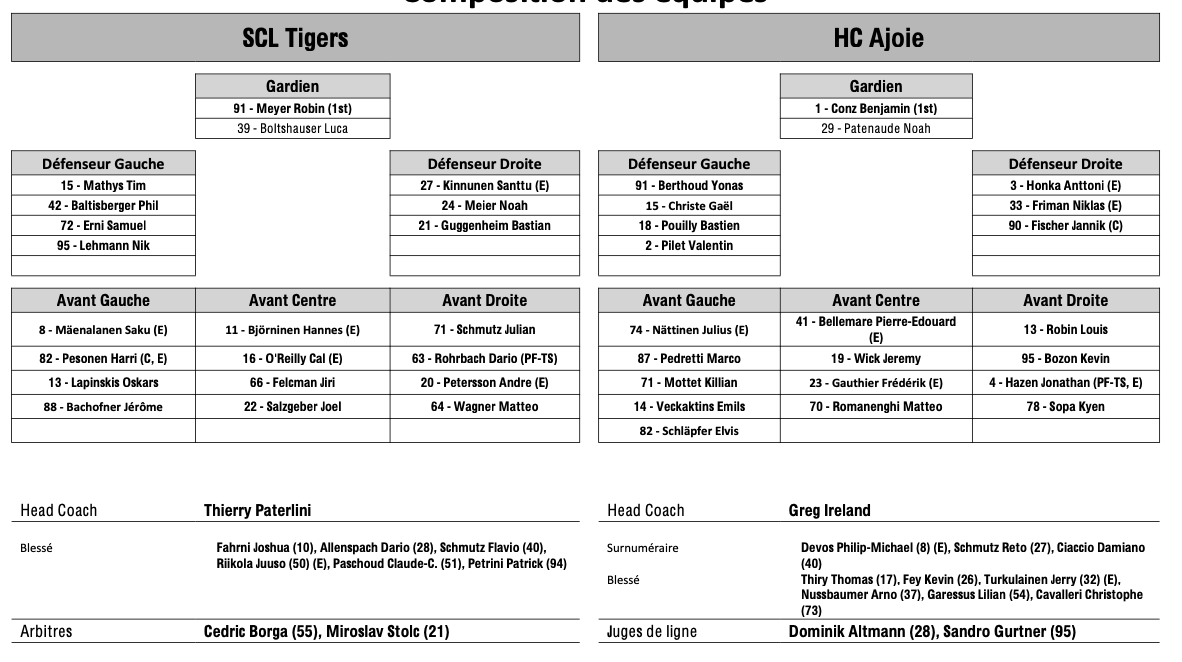 Formation des équipes et joueurs indisponibles pour le match Langnau vs Ajoie 03/10/2025 Follow SwissHabs Derniers articles Il y a 15 heures Régis Fuchs sera honoré cette semaine Il y a 16 heures Prolongations de contrats à l'EHC Coire Il y a 18 heures Diego Kostner absent quelques semaines Il y a 18 heures Pontus Åberg passera les prochains matchs à Kloten Il y a 20 heures Deux autres renforts pour le HC Viège