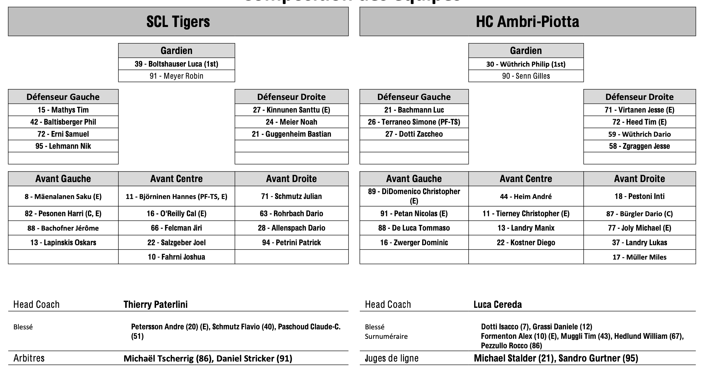 Formation des équipes et joueurs indisponibles pour le match Langnau vs Ambri 12/09/2025 Follow SwissHabs Derniers articles Il y a 18 heures Régis Fuchs sera honoré cette semaine Il y a 19 heures Prolongations de contrats à l'EHC Coire Il y a 21 heures Diego Kostner absent quelques semaines Il y a 21 heures Pontus Åberg passera les prochains matchs à Kloten Il y a 23 heures Deux autres renforts pour le HC Viège