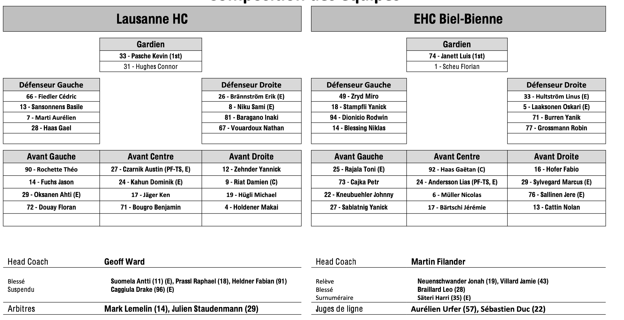 Formation des équipes et joueurs indisponibles pour le match Lausanne vs Bienne 10/10/2025 Follow SwissHabs Derniers articles Il y a 15 heures Régis Fuchs sera honoré cette semaine Il y a 16 heures Prolongations de contrats à l'EHC Coire Il y a 18 heures Diego Kostner absent quelques semaines Il y a 18 heures Pontus Åberg passera les prochains matchs à Kloten Il y a 20 heures Deux autres renforts pour le HC Viège