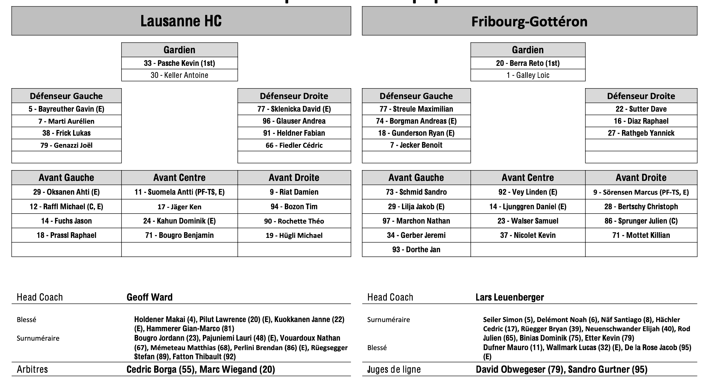 Formation des équipes et joueurs indisponibles pour le match Lausanne vs Fribourg 03/04/2025 Follow SwissHabs Derniers articles Il y a 7 minutes Formation des équipes et joueurs indisponibles pour le match Davos vs Langnau Il y a 9 minutes Formation des équipes et joueurs indisponibles pour le match Rapperswil vs Genève Il y a 11 minutes Formation des équipes et joueurs indisponibles pour le match Ambri vs Lausanne Il y a 12 minutes Formation des équipes et joueurs indisponibles pour le match Zoug vs Fribourg Il y a 15 minutes Formation des équipes et joueurs indisponibles pour le match Zurich vs Ajoie