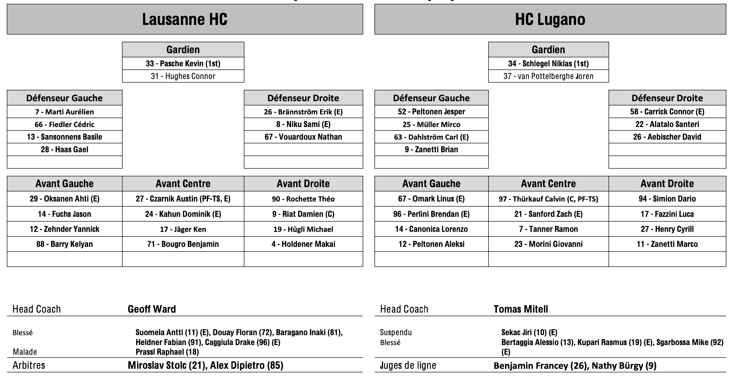 Formation des équipes et joueurs indisponibles pour le match Lausanne vs Lugano 18/10/2025 Follow SwissHabs Derniers articles Il y a 13 minutes Les Blues acquièrent Gauthier dans un échange avec les Islanders Il y a 55 minutes Mikko Rantanen blessé et absent avec les Stars après les JO Il y a une heure Tarmo Reunanen a été exclu de son équipe Il y a 2 heures Enzo Corvi se rapproche d'un retour au jeu Il y a 2 heures Nico Dünner blessé : Jacob Larsson nouveau capitaine des Rapperswil-Jona Lakers