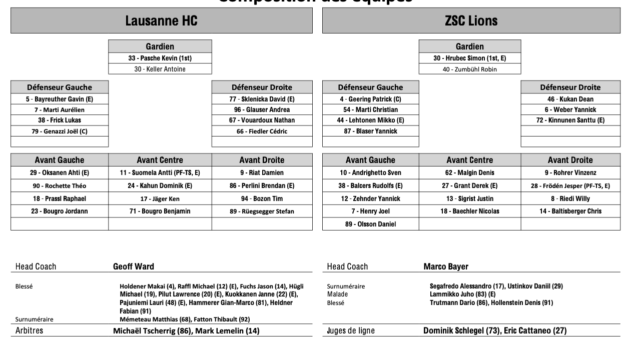 Formation des équipes et joueurs indisponibles pour le match Lausanne vs Zurich - Jason Fuchs à son tour sur la touche du côté de Lausanne 19/04/2025 Follow SwissHabs Derniers articles Il y a 2 heures Retour de l'action en NHL : quelques chiffres à retenir Il y a 3 heures Lian Bichsel de retour, Nino Niederreiter blessé Il y a 4 heures Pénurie d’entraîneurs suisses d’élite en hockey sur glace Il y a 6 heures Un mois d'absence pour Sidney Crosby Il y a 7 heures Changements au sein du département athlétique des SCL Tigers et SCL Young Tigers