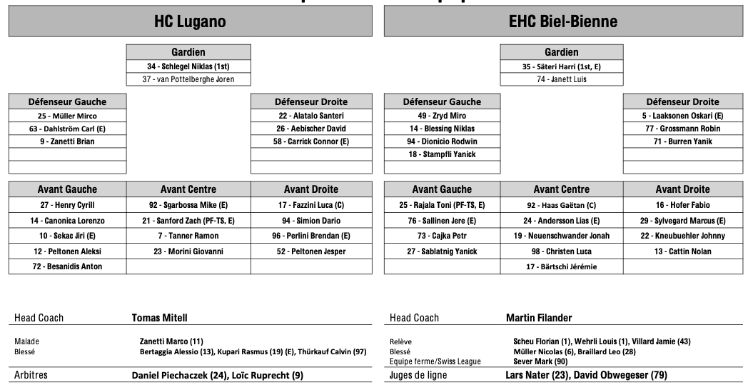Formation des équipes et joueurs indisponibles pour le match Lugano vs Bienne 15/11/2025 Follow SwissHabs Derniers articles Il y a 15 heures Régis Fuchs sera honoré cette semaine Il y a 16 heures Prolongations de contrats à l'EHC Coire Il y a 18 heures Diego Kostner absent quelques semaines Il y a 18 heures Pontus Åberg passera les prochains matchs à Kloten Il y a 20 heures Deux autres renforts pour le HC Viège