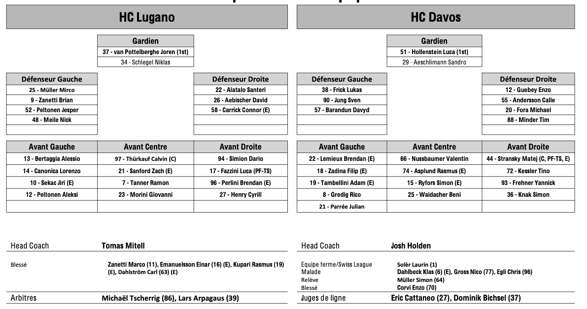 Formation des équipes et joueurs indisponibles pour le match Lugano vs Davos 24/01/2026 Follow SwissHabs Derniers articles Il y a 15 heures Régis Fuchs sera honoré cette semaine Il y a 16 heures Prolongations de contrats à l'EHC Coire Il y a 18 heures Diego Kostner absent quelques semaines Il y a 18 heures Pontus Åberg passera les prochains matchs à Kloten Il y a 20 heures Deux autres renforts pour le HC Viège