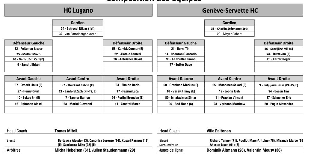 Formation des équipes et joueurs indisponibles pour le match Lugano vs Genève 01/11/2025 Follow SwissHabs Derniers articles Il y a 18 heures Régis Fuchs sera honoré cette semaine Il y a 19 heures Prolongations de contrats à l'EHC Coire Il y a 21 heures Diego Kostner absent quelques semaines Il y a 21 heures Pontus Åberg passera les prochains matchs à Kloten Il y a 23 heures Deux autres renforts pour le HC Viège