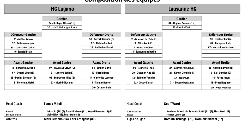 Formation des équipes et joueurs indisponibles pour le match Lugano vs Lausanne 26/09/2025 Follow SwissHabs Derniers articles Il y a 15 heures Régis Fuchs sera honoré cette semaine Il y a 16 heures Prolongations de contrats à l'EHC Coire Il y a 18 heures Diego Kostner absent quelques semaines Il y a 18 heures Pontus Åberg passera les prochains matchs à Kloten Il y a 20 heures Deux autres renforts pour le HC Viège