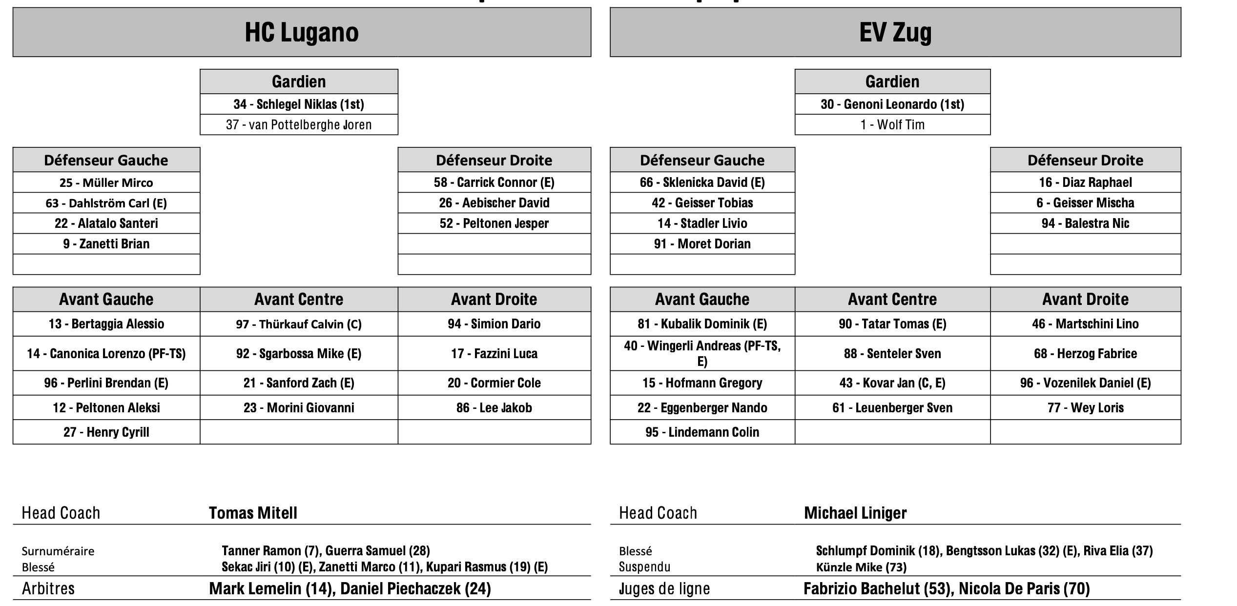 Formation des équipes et joueurs indisponibles pour le match Lugano vs Zoug 12/09/2025 Follow SwissHabs Derniers articles Il y a 18 heures Régis Fuchs sera honoré cette semaine Il y a 19 heures Prolongations de contrats à l'EHC Coire Il y a 21 heures Diego Kostner absent quelques semaines Il y a 21 heures Pontus Åberg passera les prochains matchs à Kloten Il y a 23 heures Deux autres renforts pour le HC Viège