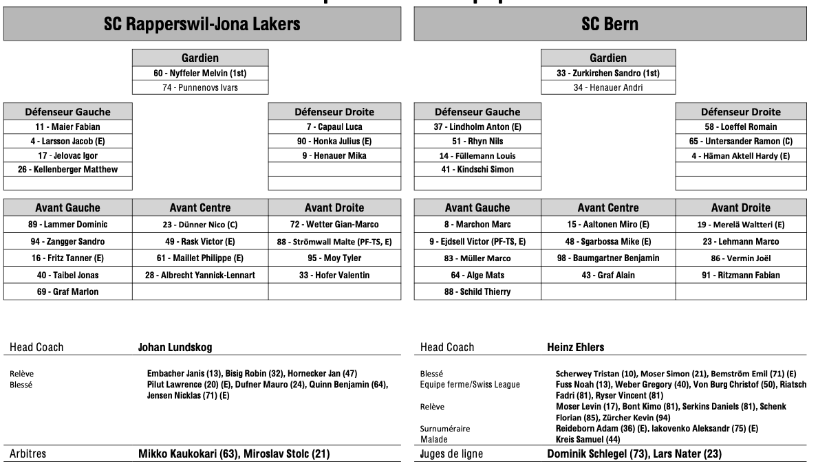 Formation des équipes et joueurs indisponibles pour le match Rapperswil vs Berne 23/01/2026 Follow SwissHabs Derniers articles Il y a 17 heures Régis Fuchs sera honoré cette semaine Il y a 18 heures Prolongations de contrats à l'EHC Coire Il y a 20 heures Diego Kostner absent quelques semaines Il y a 20 heures Pontus Åberg passera les prochains matchs à Kloten Il y a 22 heures Deux autres renforts pour le HC Viège
