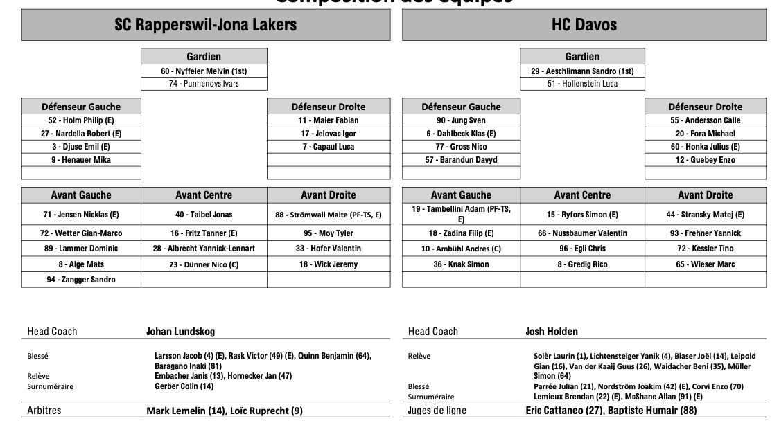 Formation des équipes et joueurs indisponibles pour le match Rapperswil vs Davos 01/03/2025 Follow SwissHabs Derniers articles Il y a 3 heures Retour de l'action en NHL : quelques chiffres à retenir Il y a 5 heures Lian Bichsel de retour, Nino Niederreiter blessé Il y a 6 heures Pénurie d’entraîneurs suisses d’élite en hockey sur glace Il y a 8 heures Un mois d'absence pour Sidney Crosby Il y a 9 heures Changements au sein du département athlétique des SCL Tigers et SCL Young Tigers