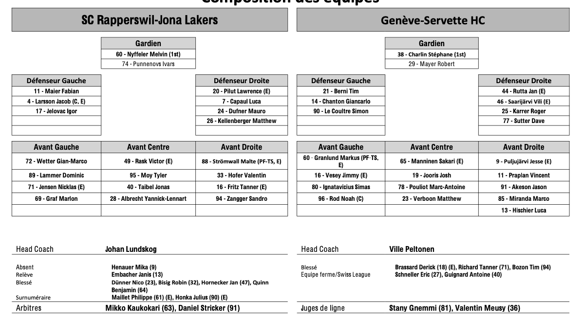 Formation des équipes et joueurs indisponibles pour le match Rapperswil vs Genève 24/02/2026 Follow SwissHabs Derniers articles Il y a une heure Echange entre les Penguins de Pittsburgh et l'Avalanche du Colorado Il y a 2 heures Formation des équipes et joueurs indisponibles pour le match Davos vs Langnau Il y a 2 heures Formation des équipes et joueurs indisponibles pour le match Rapperswil vs Genève Il y a 2 heures Formation des équipes et joueurs indisponibles pour le match Ambri vs Lausanne Il y a 2 heures Formation des équipes et joueurs indisponibles pour le match Zoug vs Fribourg