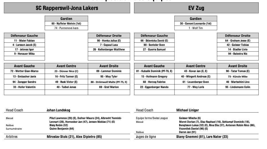 Formation des équipes et joueurs indisponibles pour le match Rapperswil vs Zoug 24/10/2025 Follow SwissHabs Derniers articles Il y a 4 minutes Ajoie se renforce avec Tarmo Reunanen pour cette fin de saison Il y a 15 minutes Trois joueurs absents du côté de Genève Il y a une heure Des nouvelles de l'infirmerie du HC Bienne Il y a 3 heures Nolan Diem portera les couleurs d'Ajoie Il y a 4 heures Le point sur l'effectif du CP Berne