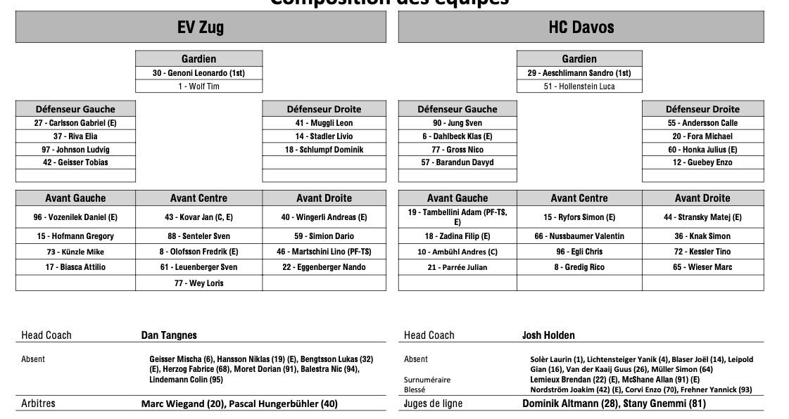 Formation des équipes et joueurs indisponibles pour le match Zoug vs Davos 18/03/2025 Follow SwissHabs Derniers articles Il y a 40 minutes Le point sur l'effectif du CP Berne Il y a une heure JO : quel impact sur le développement du hockey aux Etats-Unis ? Il y a une heure Raphael Diaz va faire son retour au jeu face à Fribourg Il y a 2 heures Des nouvelles très mitigées concernant Marcus Sörensen Il y a 2 heures Un autre gardien à disposition du HC Ajoie