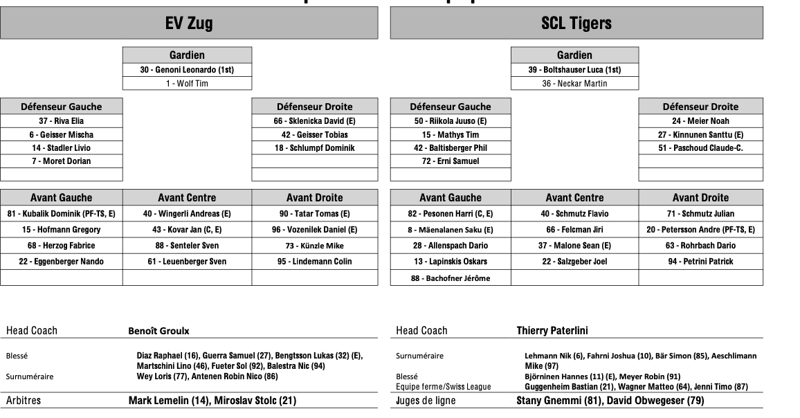 Formation des équipes et joueurs indisponibles pour le match Zoug vs Langnau 24/01/2026 Follow SwissHabs Derniers articles Il y a 15 heures Régis Fuchs sera honoré cette semaine Il y a 16 heures Prolongations de contrats à l'EHC Coire Il y a 18 heures Diego Kostner absent quelques semaines Il y a 18 heures Pontus Åberg passera les prochains matchs à Kloten Il y a 20 heures Deux autres renforts pour le HC Viège