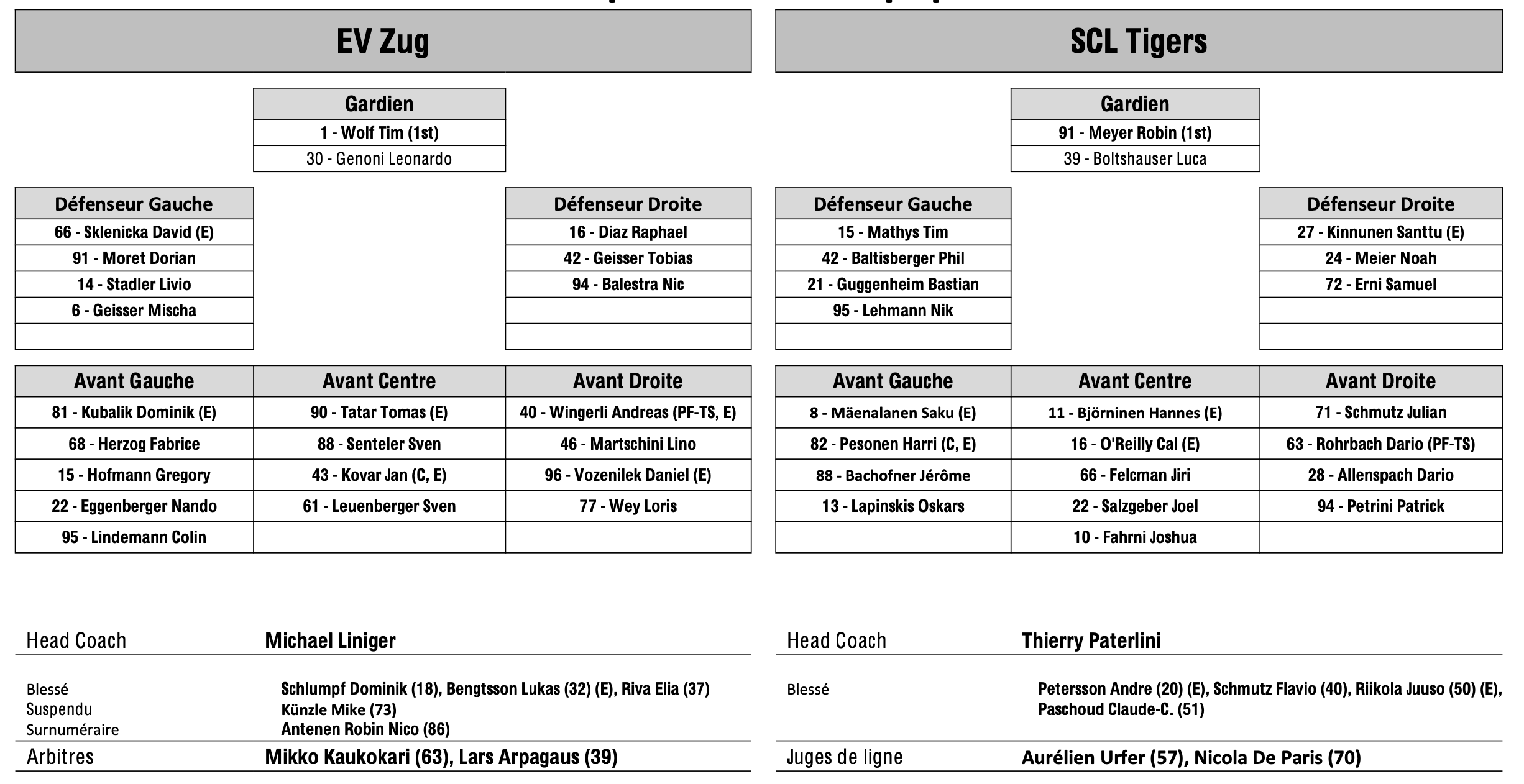 Formation des équipes et joueurs indisponibles pour le match Zoug vs Langnau 13/09/2025 Follow SwissHabs Derniers articles Il y a 17 heures Régis Fuchs sera honoré cette semaine Il y a 18 heures Prolongations de contrats à l'EHC Coire Il y a 20 heures Diego Kostner absent quelques semaines Il y a 20 heures Pontus Åberg passera les prochains matchs à Kloten Il y a 22 heures Deux autres renforts pour le HC Viège